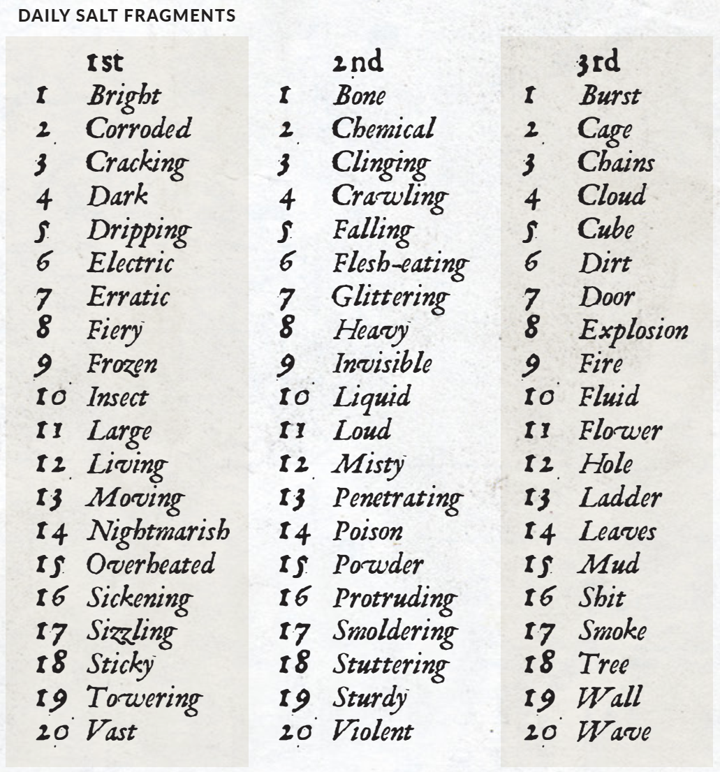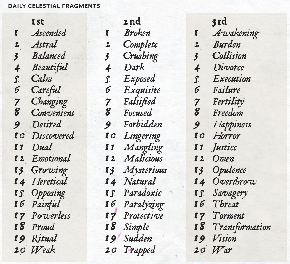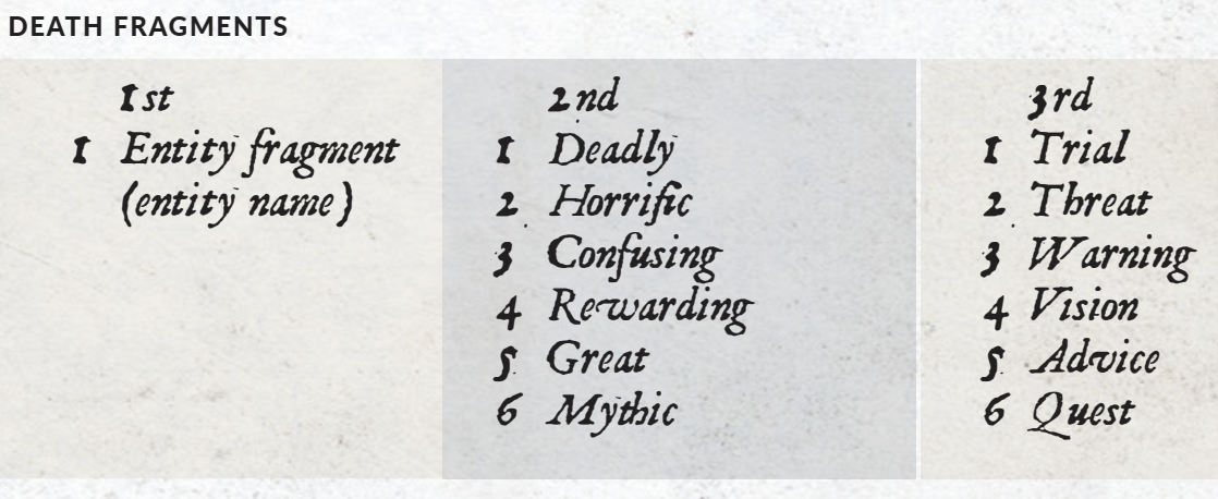 When the third step is finished, immediately generate the two other fragments by rolling 1D6 on the second and third columns of the death fragments table, below. You may reroll a fragment for each sacrifice made beyond the first (four mundane sacrifices allow you to reroll once, etc.), and must keep the new result – or reroll again if you still have any rerolls remaining.