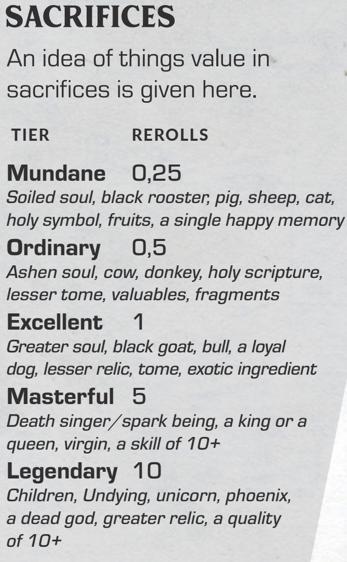 In contrast to other schools, casting a death ritual is always a complex task, coordinated by you but performed by the whole party. It often involves sanctifying the ritual location by drawing symbols and patterns on the ground, chanting psalms in long forgotten languages, and using paraphernalia like incense, candles, and other catalysts – all of which are based on the entity being communed with. Finally, at least one sacrifice is required, although it is advisable to go for more, depending on how much control you want to have over the outcome.