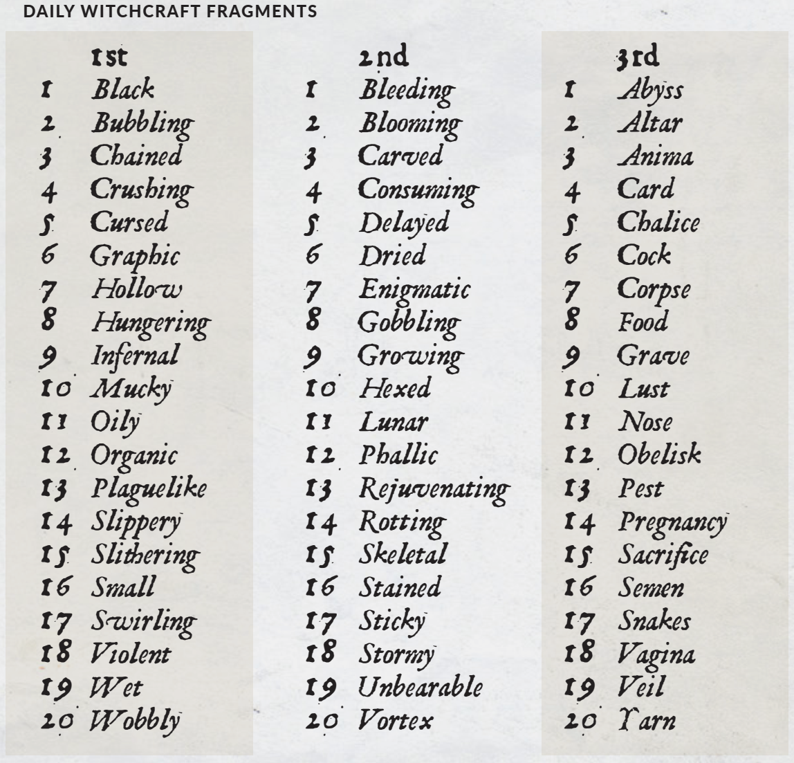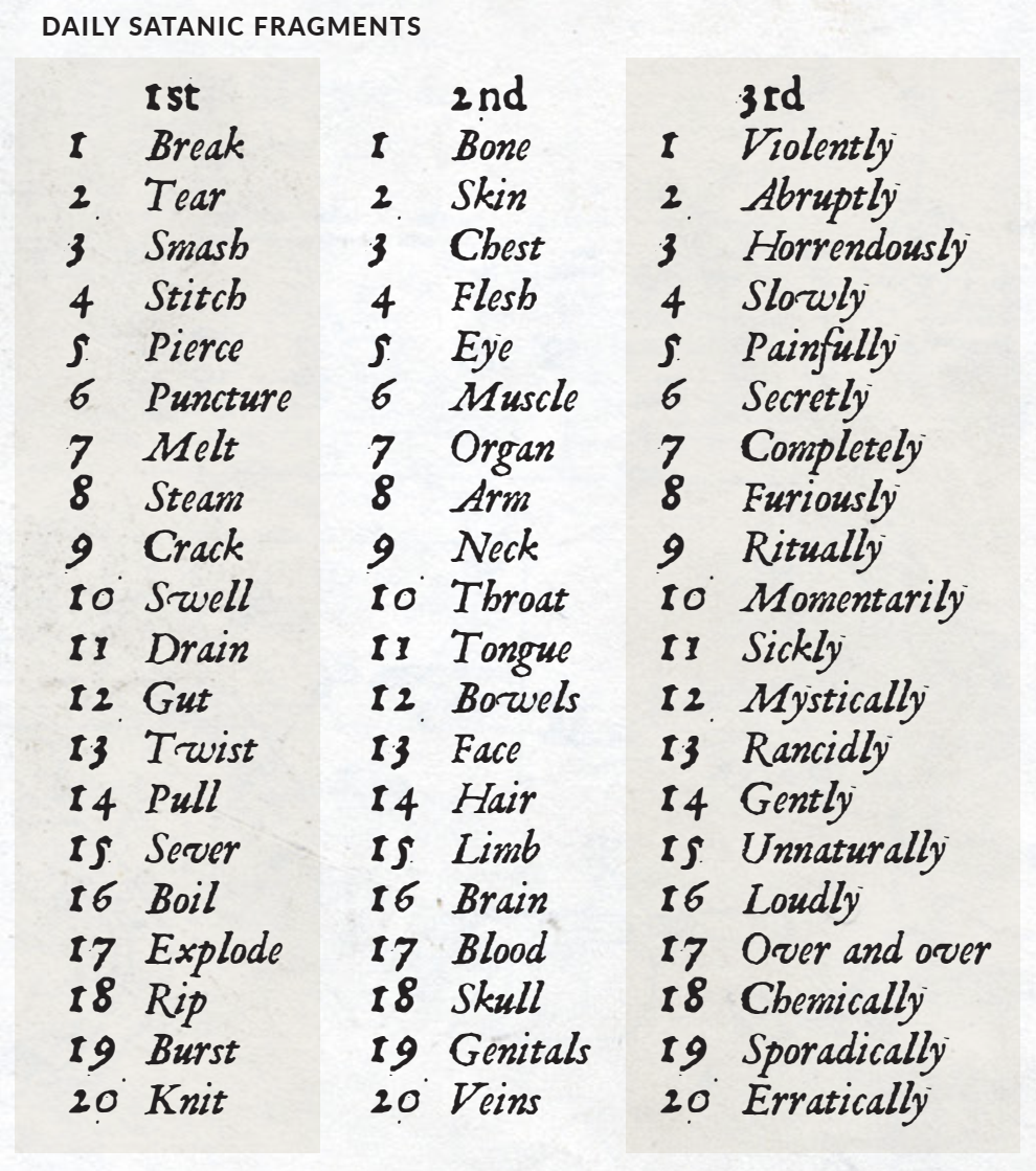 The Black Priest wants to cast a ritual using his learned fragments from columns 2 and 3, Spine + Mercilessly. Since he is out of other fragments, he rolls an improvised fragment for column 1 and pays 1 [SAN]. He rolls “Drain,” giving him Drain + Spine + Mercilessly. He explains that his intention is to weaken a centurion his party is fighting by emptying its backbone of all liquid. He rolls for Abyssal Rituals and gets a success, and the two learned fragments add 2 [+].