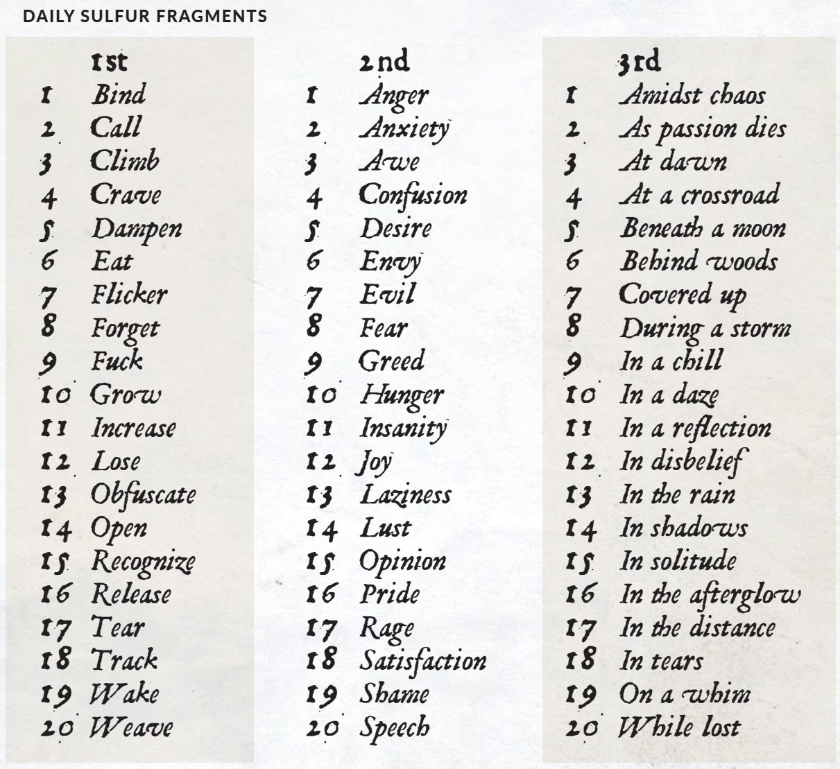 Sulfur is the soul and the personality, the will and aspiration. Sulfur rituals focus on changing someone’s motivations, ideas, or desires. Often used to manipulate and trick but using the target’s position or network it can become very powerful magic. Because they are aether rituals, there is often a need for some kind of distraction when using them on unwilling targets.