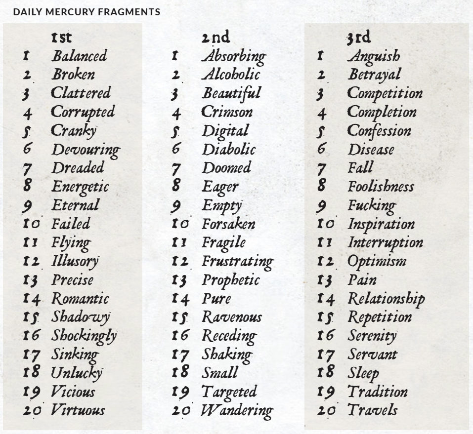 Mercury is the spirit and the divine connection with the Eternals that all beings possess. Mercury rituals focus on altering someone or something’s destiny by changing the events unfolding before them. Just like celestial rituals, only their intent is controllable by the mystic, timing and final effect is up to fate. Mercury rituals can only have one target and, being an aether ritual, they are far from invisible.
