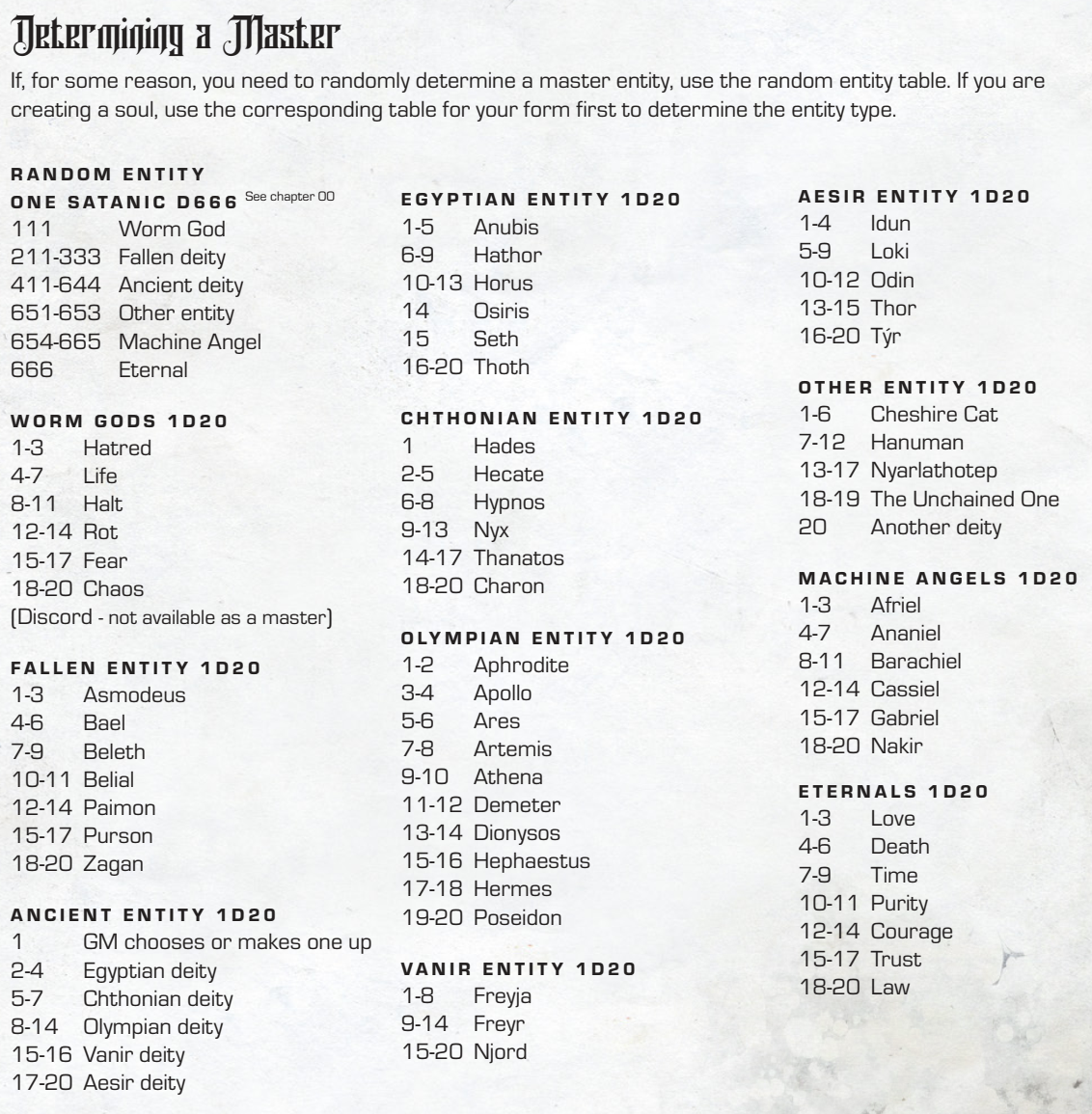 | Ancient divine entities from a long forgotten past before the Rapture, awoken during Satans’ absence. - Egyptian Entities - Chthonian Entities - Olympian Entities - Vanir Entities - Aesir Entities | |