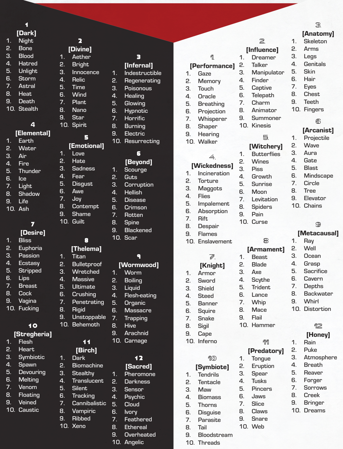 Gaining a postscendent power is one of the highest rewards in Astro Inferno, often turning you into an avatar for your master, a select and coveted champion above others. When you gain one, roll 1D10 on each of the two power tables indicated by its source. Table names are indicated between brackets, or may indicate a roll to determine the power table. The bracket to the left always indicates a table to the left, and the bracket to the right, a table to the right.